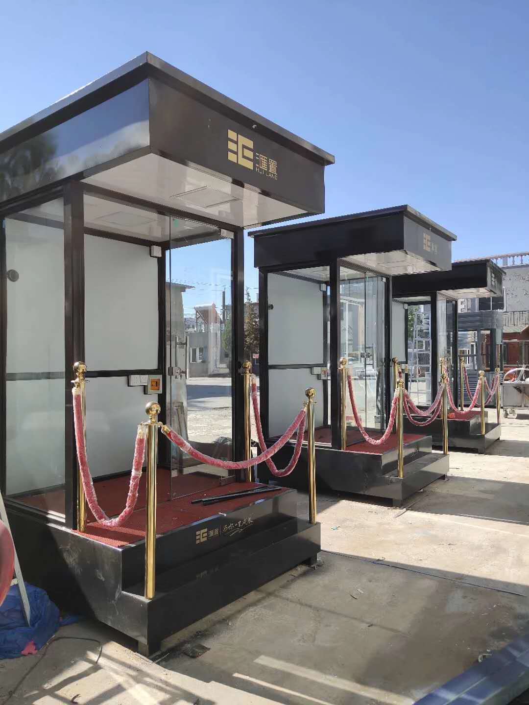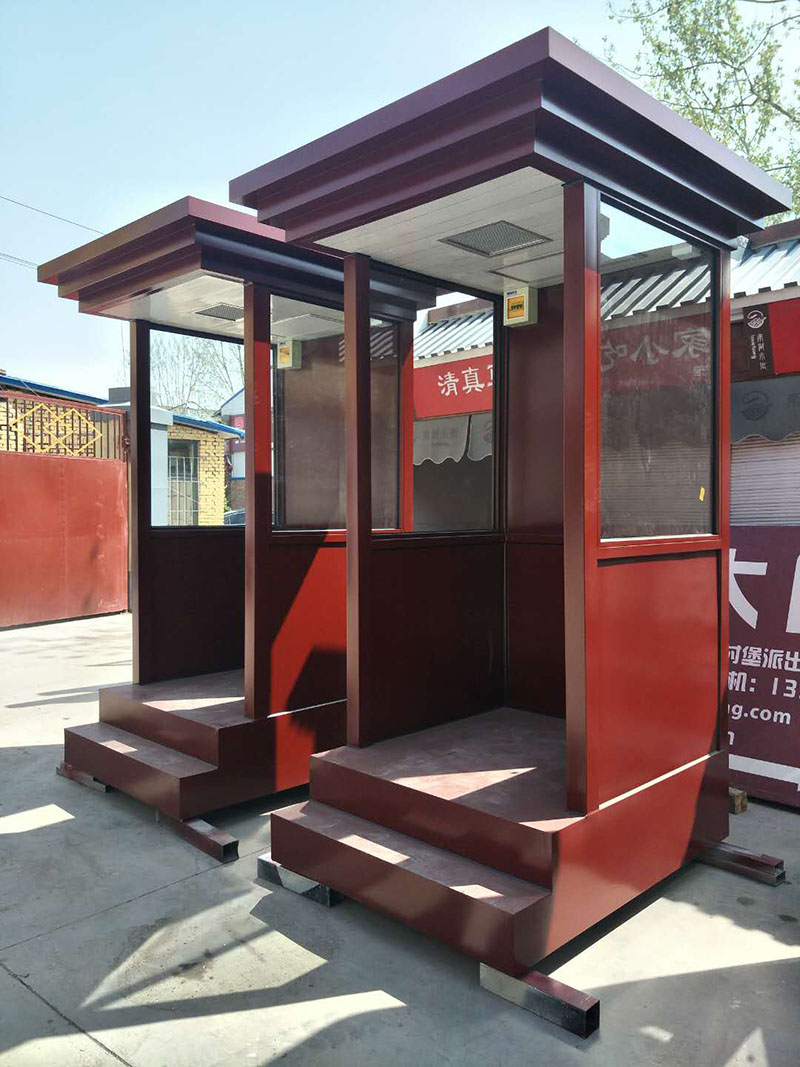 值班崗?fù)さ闹饕埞菫殇摻Y(jié)構(gòu)龍骨,起尺寸為40x60x1.5mm鍍鋅龍骨;立柱一般為堅(jiān)固耐用的型鋼,尺寸規(guī)格有80x80x2.0mm,40x80x2.0mm等等,可根據(jù)產(chǎn)品的大小不同而來(lái)決定立柱的大小;玻璃一般為8mm鋼化玻璃,具有較強(qiáng)的抗沖擊力,即使破碎也不會(huì)傷到人;地板為3mm防滑鋼板,鋪紅色地毯,四周可用鈦金立柱和紅絨繩作為裝飾件,使產(chǎn)品看起來(lái)更美觀,大氣,高檔。